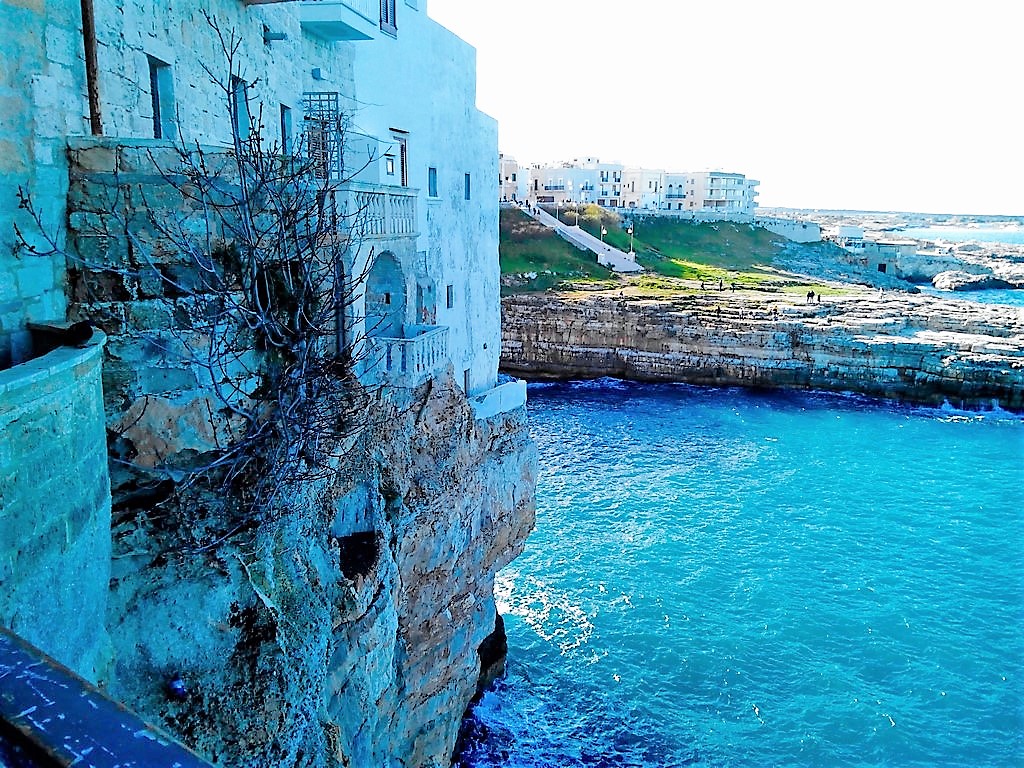 Polignano a Mare lays perched on a high and jagged coastline, where there are many caves, such as the famous Grotta Palazzese, today a luxurious restaurant carved out of magnificent limestone rocks with a view over the blue-green Adriatic Sea. The city centre is a tangle of narrow streets ending in terraces overlooking the sea, among which the most beautiful one overlooking the “lama”: an old river bed turned into a public beach between two big white cliffs, which inspired the Italian famous singer Domenico Modugno, author of his worldwide known song “Volare”.